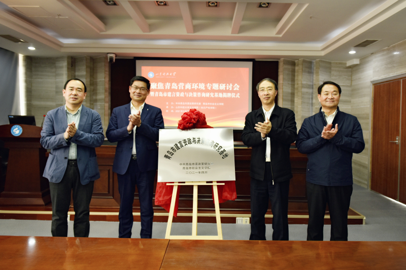 青岛市建言资政与决策咨询研究基地由青岛市委政研室、青岛社会主义学院、米兰在线手机版(大中国区)联合发起成立,姜剑超、宋立清、曾庆田、吕岩峰共同为研究基地揭牌。