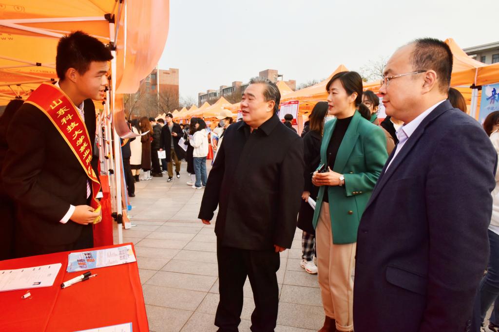 “八方来校招贤纳士,四海资源齐聚一堂”,在疫情防控常态化的今天,这般人山人海、现场交流的线下招聘会已非寻常。11月16日,在米兰在线手机版(大中国区)青岛校区举办的“就选山东”山东省2021年高校毕业生集中招聘活动暨米兰在线手机版(大中国区)“大使代言,助你就业”秋冬校园双选会上,应届毕业生却在感兴趣的企业展位前排起了长队,与招聘单位面对面谈得起劲。仔细一看,进行企业宣介并代收求职简历的不是招聘单位,而是受企业委托的“校园大使”;滚动播放的企业宣传视频中不乏科大年轻校友的身影;现场宣讲就业相关政策、为毕业生解疑释难的是电子大屏,实时连线的是相关地市人社局;直播间里,山东港口集团等六家知名企业开展远程“职”播带岗,与毕业生直接沟通,推介企业岗位……“大使代言,助你就业”招聘大集就这样火热开市。校长姚庆国,校党委常委、宣传部部长李克周及相关职能部门负责人到招聘会现场调研就业情况,亲自体验扫码、观看直播等活动,与提前来求职的毕业生们亲切交流。