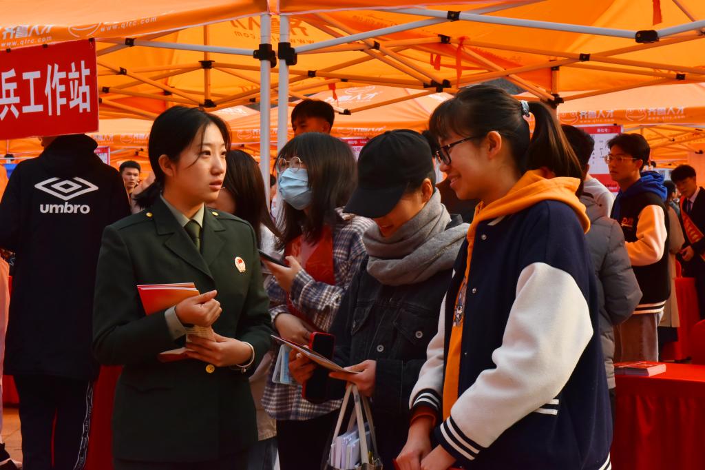 与校园大使一起忙于介绍的还有学校的征兵宣传员们,他们全年都在为学校征兵工作发挥朋辈引领作用。“今天现场有100余人咨询了入伍政策,32人登记了征兵信息。这得益于近年来学校开展了全方位、立体化、全覆盖的征兵宣传,通过征兵宣传进入学教育、进招聘活动,不断提升参与度和覆盖面,形成了大学生参军入伍热情高、兵源素质强、参军数量多的良好氛围,2021年,学校共有208名学子参军入伍,入伍学生数为历年最多。我校自动化专业2019级学生徐越更是以‘军营大学生战士’入选全国第四届‘闪亮的日子—青春该有的模样’大学生就业创业人物事迹典型,这是山科退役复学学生第二次入选就业创业典型人物。”学生处副处长孔环说道。