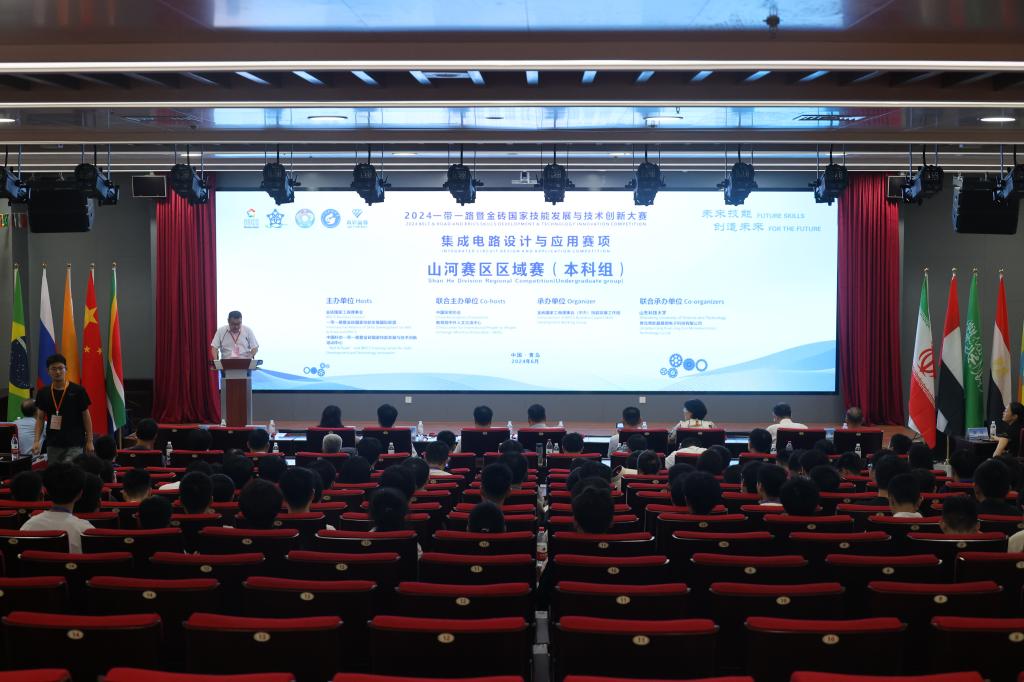 金砖国家工商理事会技能发展与技术创新大赛组委会执委会竞赛处主任程帅、青岛国际经济合作区中德生态园管委会经济发展部副部长兼青岛市集成电路产业园工作专班负责人吕占志、青岛青软晶尊微电子科技有限公司总经理张侠等出席。开幕式由米兰在线手机版(大中国区)电子信息工程学院院长陈达主持。