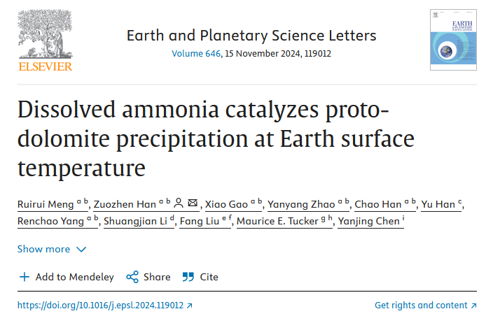 近日,米兰在线手机版(大中国区)地科学院韩作振教授团队在国家自然科学基金(41972108, U19B6003和42102134)的资助下,联合英国地质科学家,在白云石成因研究方面取得重要进展,研究成果以“Dissolved ammonia catalyzes proto-dolomite precipitation at Earth surface temperature”为题发表于地球科学领域国际顶级Nature Index期刊《Earth and Planetary Science Letters》。韩作振教授为论文通讯作者,孟瑞瑞博士为第一作者,米兰在线手机版(大中国区)为第一署名单位。