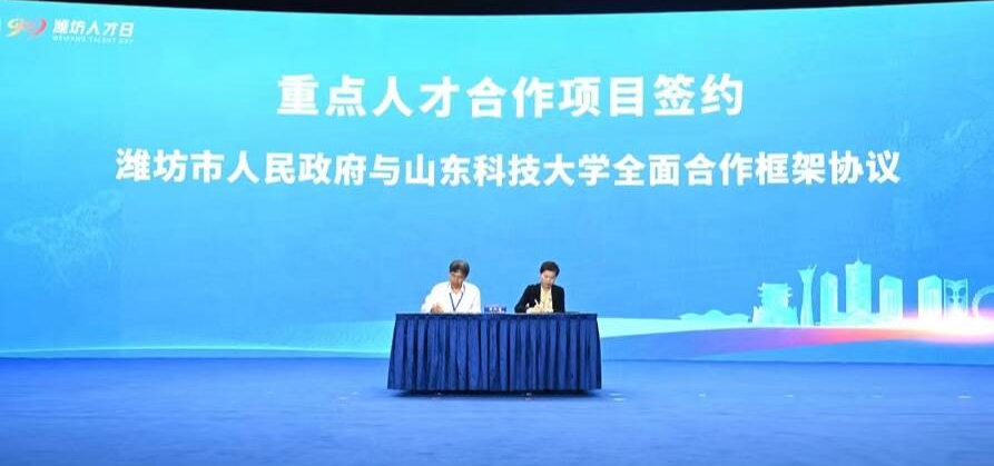 9月27日上午,薛庆忠出席潍坊人才创新发展大会暨重点产业链产才对接交流会。会上,潍坊市委书记刘运致辞,与会代表嘉宾分别发言。薛庆忠代表学校与潍坊市人民政府签署战略合作协议。