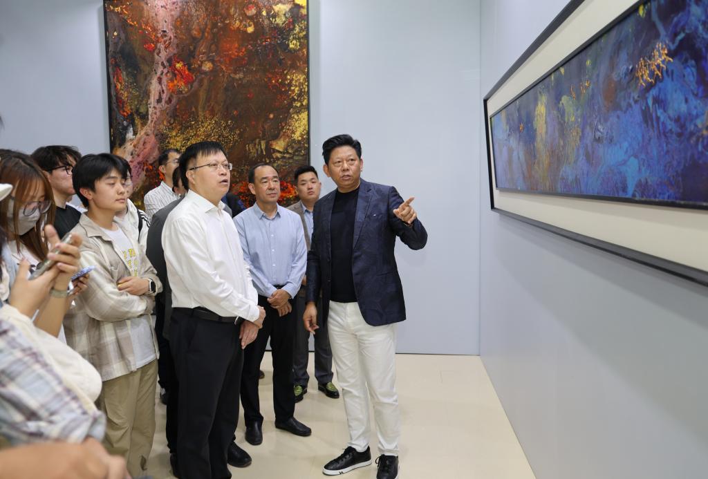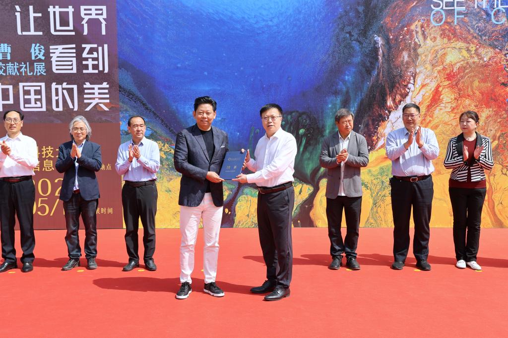 王君松在致辞中代表学校向曹俊校友在入校40周年之际回到母校开展系列活动致以诚挚的敬意。他说,曹俊校友被联合国官员称为“影响世界的华人艺术大家”,此次献礼展带来了其潜心创作的30余幅代表作品,为师生提供了近距离感受艺术魅力、与大师对话的宝贵机会。他希望全体师生以曹俊校友为榜样,追求卓越、勇攀高峰,在各自人生画布上,画出属于山科人的精彩;希望师生以此为契机,推动艺术与科技、人文的交叉融合,为学校“双一流”建设注入新的艺术活力;衷心期望校友常回母校看看,未来创作更多佳作,续写艺术传奇。