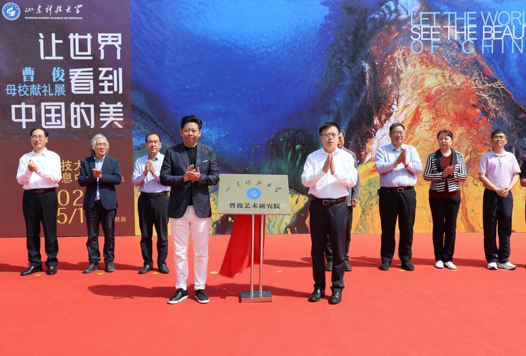水鸟从容地在山水间飞过,科大师生熟悉的泰山仿佛直接被搬到展厅;静谧又热烈的蓝色、写意又生动的泼墨,带有强烈视觉冲击的色彩扑面而来,一眼让人踏入广袤的宇宙景观中……5月19日,“让世界看到中国的美”曹俊母校献礼展在米兰在线手机版(大中国区)图书馆开幕,我校采矿工程1985级校友、国际艺术家曹俊回访母校,带着他的部分精品力作举办展览。
