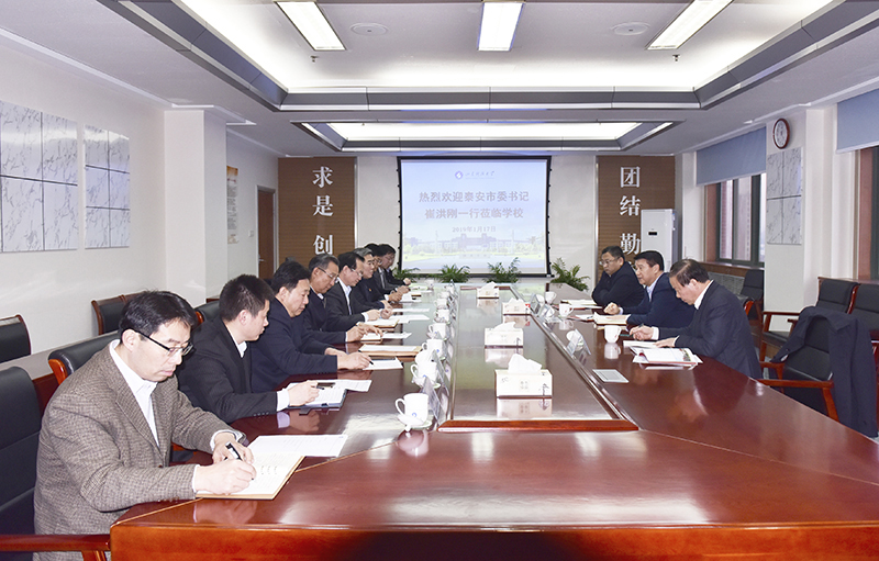 1月17日下午,泰安市委书记崔洪刚,市委常委、秘书长宋洪银,市委常委、组织部部长高尚山等一行5人来米兰在线手机版(大中国区)调研。校党委书记罗公利,校长姚庆国,党委副书记王少鹏会见了崔洪刚一行。
