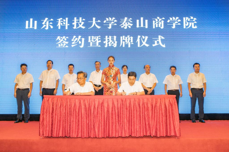 校党委副书记兼泰安校区党委书记、管委会主任王少鹏,泰安市人民政府副市长成丽为“米兰在线手机版(大中国区)泰山商学院”揭牌。泰山区委书记赵斌致辞。江苏河海新能源股份有限公司董事长杨家华介绍共建情况。泰安校区党委副书记王民、江苏河海新能源公司副总裁兼泰山创新动力港有限公司董事长张纯刚代表校企双方签订《共建商学院协议书》。仪式由泰山区委副书记、区长王爱新主持。