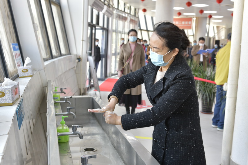 在学生返校进入校园的检测查验演练场景中,安全管理组工作人员设置回形隔离等待通道和醒目标识,提醒学生佩戴口罩、相互间隔1米以上;学生管理组工作人员指导学生在排队时抽取酒精消毒湿巾对随身行李等自行擦拭消毒;健康检测组工作人员查验学生电子健康通行码,进行体温检测,体温正常、核验成功人员,进入校园。