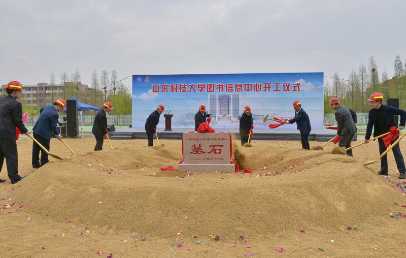 开工仪式现场,校党委领导班子成员罗公利、姚庆国、孙鹤汀、张英杰、李克周,中启胶建集团有限公司总经理郭道胜、青岛市建筑设计研究院院长陆涛、青岛信达工程管理有限公司总经理薛金涛、青海中恒信工程咨询有限公司董事长颜廷礼同擎金锹,扬土培基。