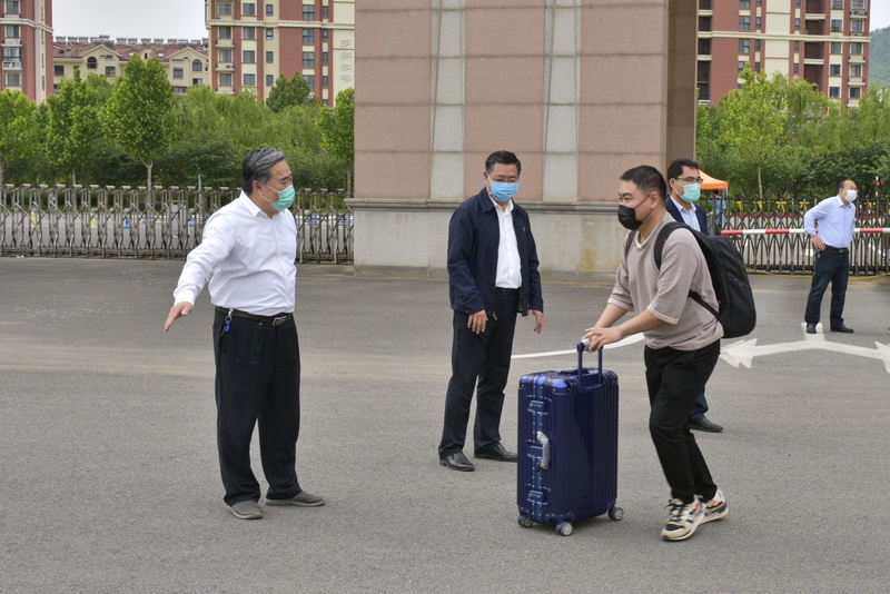 从江苏宿迁返校的电信学院研究生汤同宵一走进学校南门,早已在南门等候的校党委书记罗公利、校长姚庆国迎上前去,亲切问候“欢迎同学回家”,叮嘱他增强个人安全防护意识,树立信心,好好学习。
