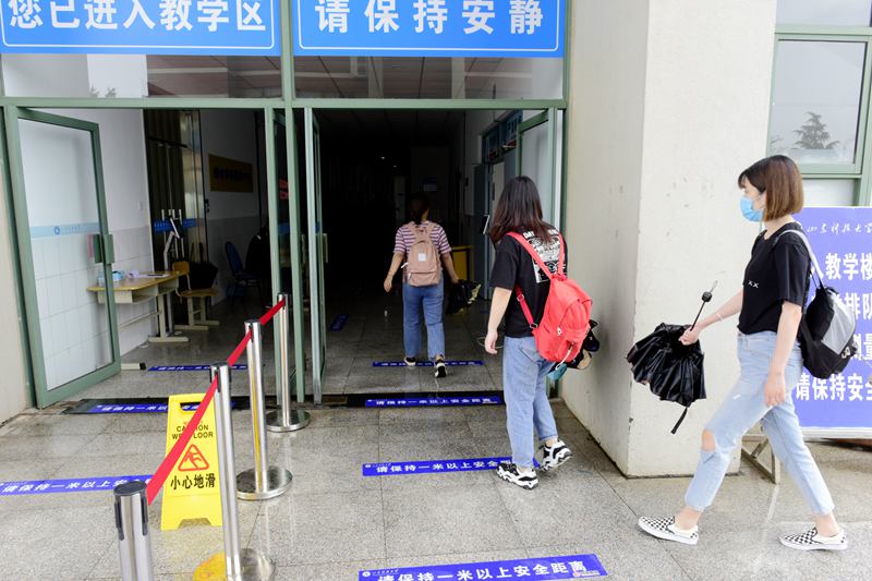 同学们严格按照一米线间隔要求排队进入教学区