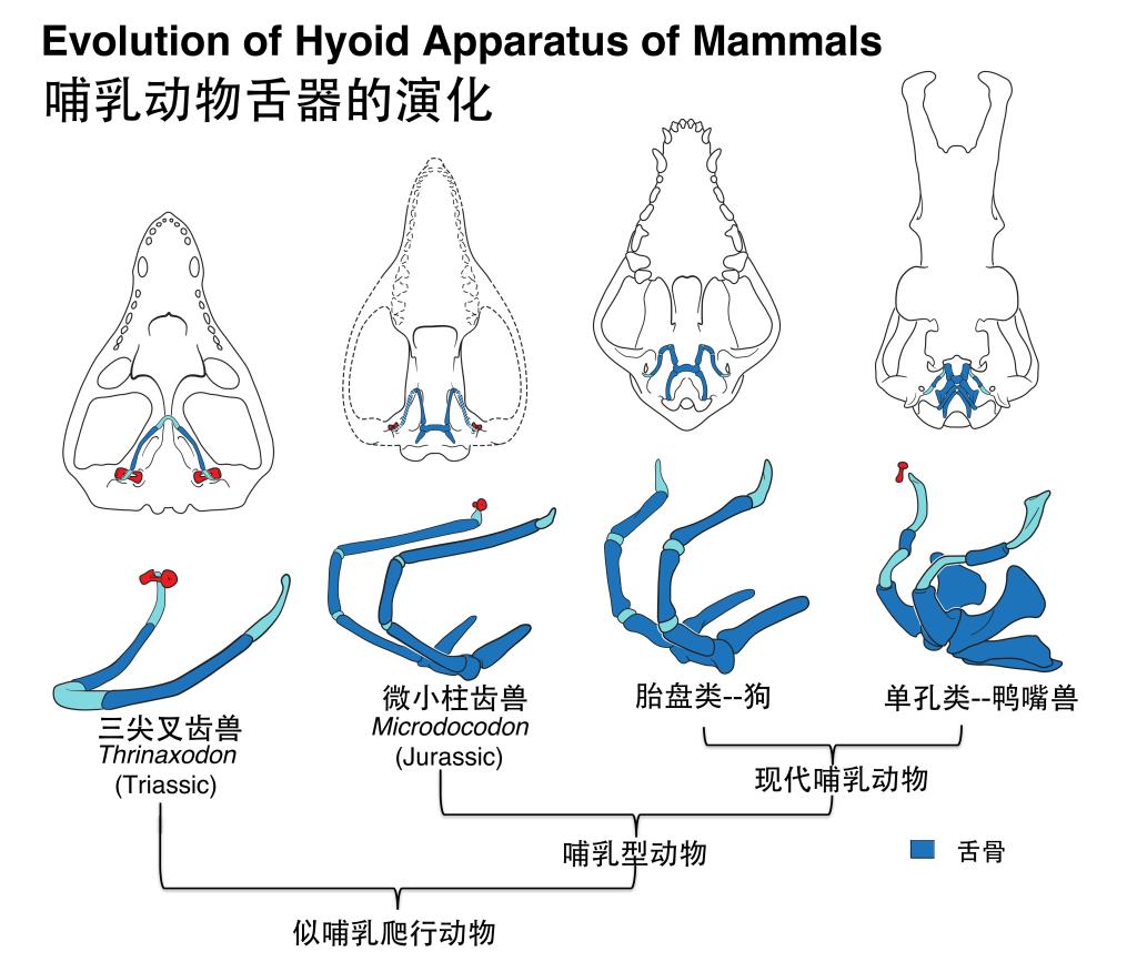 据介绍,中生代(也被称作爬行动物时代)距今有2.52亿年至6600万年,在这个远古的年代,哺乳型动物是现代哺乳动物的近亲类群,所以中生代哺乳型动物化石研究是古生物学和生命演化研究的热点。由于舌骨比较脆、比较小、难以保存,所以之前的化石研究中很少有人关注到这个领域。