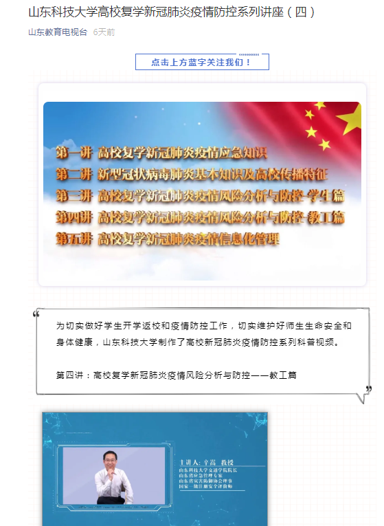 按照教育厅批示,学校决定由研究生院(学科建设办公室)牵头组织该项工作,会同安全与应急管理学院成立了5个科普讲座制作组,学校网络安全与信息化办公室和智慧树公司提供技术支持,由安全科学与工程学科程卫民、辛嵩、张延松、刘音4位专家和西海岸新区中医院应急办周进科主任作为主讲录制了5期科普讲座视频,包括:高校复学新冠肺炎疫情应急知识、新冠肺炎基本知识及高校传播特征、高校复学新冠肺炎疫情风险分析与防控—学生篇、高校复学新冠肺炎疫情风险分析与防控—教工篇、高校复学新冠肺炎疫情信息化管理。致力于开展应急科普宣传,让每一名师生都能提高防护意识、掌握科学有效的应急防护方法,科普讲座视频在央视新闻、央视频、山东教育电视台微信公众号和学校防疫专题栏目等平台播出后受到广大师生和社会大众好评。