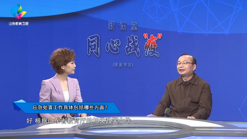5月12日起,我校和山东教育电视台联合制作的山科版战疫演示特别节目在山东教育卫视开播,连续播放5天。在每期节目播出的同时,山东教育卫视网络直播间同步与观众互动,学校学生工作部部长王震、学科建设办公室副主任张明光、安全与应急管理学院副院长刘音和山东省疾病预防控制中心的专家作为网络直播嘉宾,与主持人面对面交流,现场回复网友提问,积极回应师生及家长关切的问题。
