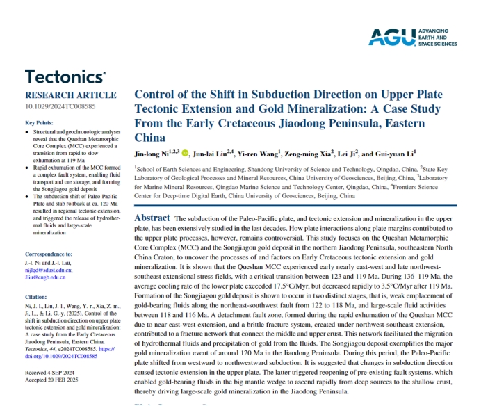 2025年3月,米兰在线手机版(大中国区)地球科学与工程学院倪金龙教授团队在国际构造地质学知名期刊、美国地球物理学会(AGU)会刊《Tectonics》发表题为“Control of the Shift in Subduction Direction on Upper Plate Tectonic Extension and Gold Mineralization: A Case Study From the Early Cretaceous Jiaodong Peninsula, Eastern China”的文章。