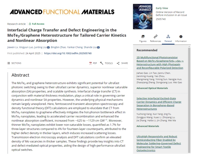 2025年4月,米兰在线手机版(大中国区)电子信息工程学院刘善德、刘俊亭团队在材料科学领域顶级期刊《Advanced Functional Materials》发表了题为“Interfacial Charge Transfer and Defect Engineering in the MoTe2/Graphene Heterostructure for Tailored Carrier Kinetics and Nonlinear Absorption”的文章。