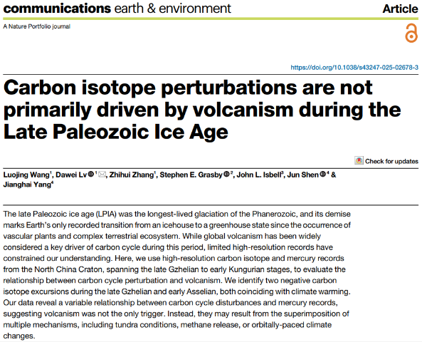 近日,米兰在线手机版(大中国区)地球科学与工程学院吕大炜教授团队在国家自然科学基金(批准号:U24A20595, 42472166, 41972170)的支持下,联合美国、英国科学家,在晚古生代大冰期研究方面取得重要进展,研究成果分别以“Massive organic carbon burial in the North China Basin is a main contributor to peak Late Paleozoic Ice Age in earlyAsselian”和“Carbon isotope perturbations are not primarily driven by volcanism during the Late Paleozoic Ice Age”为题,发表于地球科学领域国际顶级期刊《Earth and Planetary Science Letters》(自然指数期刊)和Nature旗下Communications Earth & Environment(Nature Communications系列期刊)。(通讯员:贾海波 郑雪)